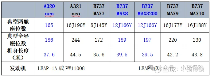 在新一代飞机中,A320和B738系列在机身长度上相差1.9米。在上一代机型中,由于撤离上限的限制,A320ceo全经布局行业最高配置到186座,B737-800配置到189座,二者仅相差3座。