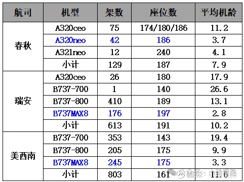 美西南以175座MAX8为主并配置大量143座MAX7。美西南机队数量为803架飞机,平均机龄12岁;其中B737-700机型353架、B737-800机型205架,B737MAX8机型245架。