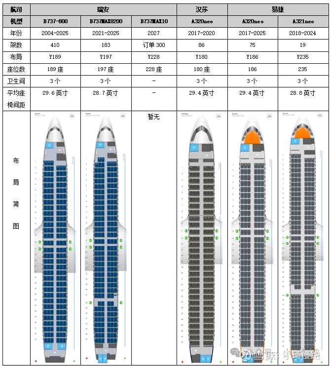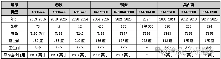 低成本航空公司的核心竞争力在于座公里成本控制,其中客舱密度优化是决定性因素。本文聚焦全球三大低成本航司(春秋、瑞安、美西南)的机队座舱布局策略,对比机型配置、布局特点、座位密度等,详情如下。