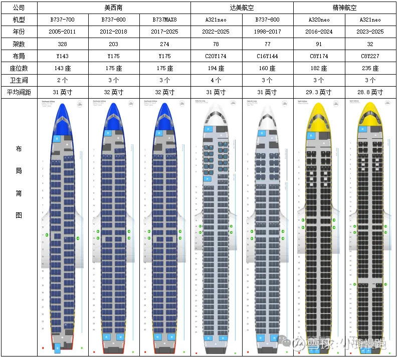 国内东航、国航、山航等全部服务航司配置176座两舱J8Y168座,不仅总座位数比美西南更多,甚至还有两排8座商务舱,其经济舱的拥挤程度已经远超低成本鼻祖美西南。