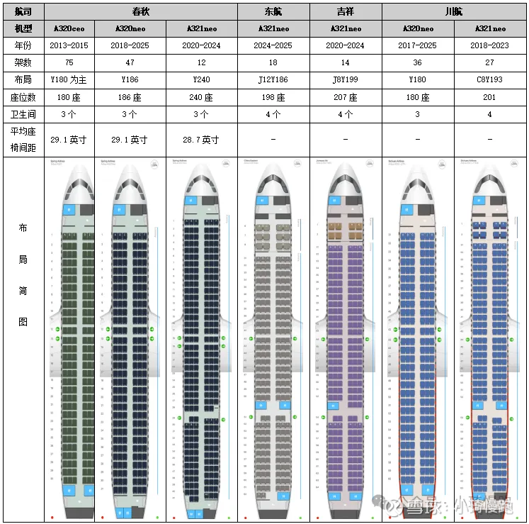 由于受制于A320机身长度限制,春秋A320ceo和A320neo最新布局座位数均采用了Y186布局。而其他国内全服务航司(如川航、南航)也开始在A320neo上配置180座全经布局,使得春秋的座位数优势开始缩小。