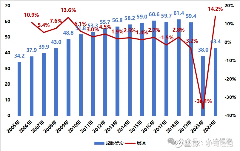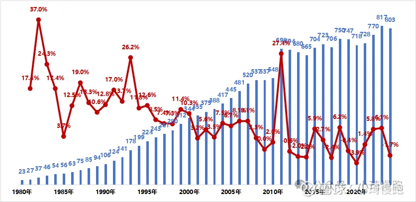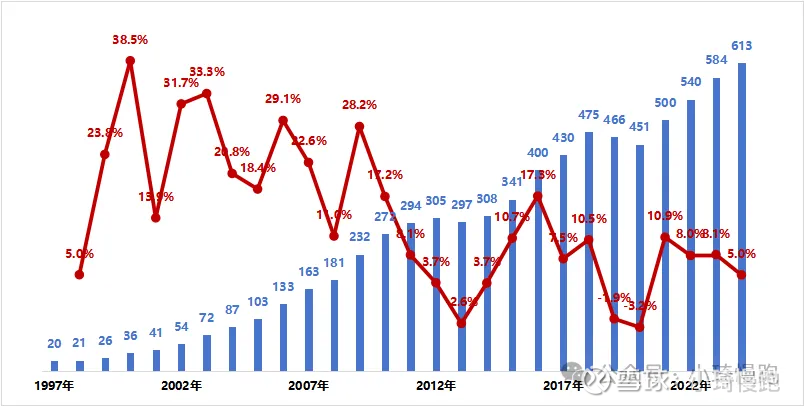 图1-1:首都机场的年度航班量与增速趋势(万架次)