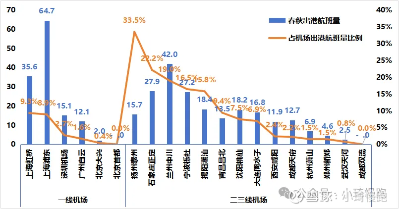 图2-1:春秋2025年暑运7-8月在主要机场的出港航班量及占比(对/天)