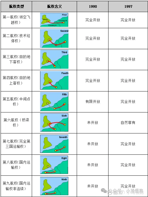 1997年欧盟全面开放了九大航权,标志着其内部单一航空市场正式建成。此后任何持有欧盟航空运营许可证的航空公司,均可在欧盟境内无限制地经营任何航线。
