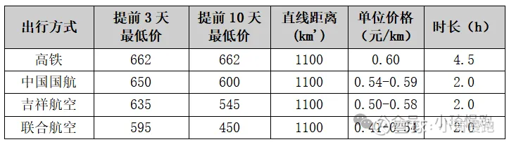 表1-1:中国北京-上海高铁与飞机对比(元)