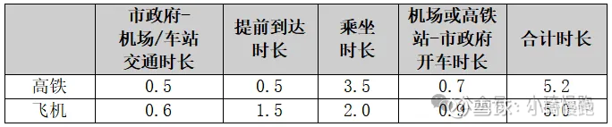 表1-3:武汉市政府-广州市政府高铁与飞机的全流程时长(小时)对比