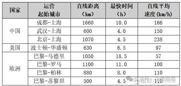 1)中国高铁实际速度近200km/小时,相比欧洲及美国的速度更快2倍。京沪线最快直线平均速度可以达到238km/h(含停靠时间),较慢的武汉-上海的速度也可以达到150km/h,而欧美铁路实际速度仅能达到100km/h左右。