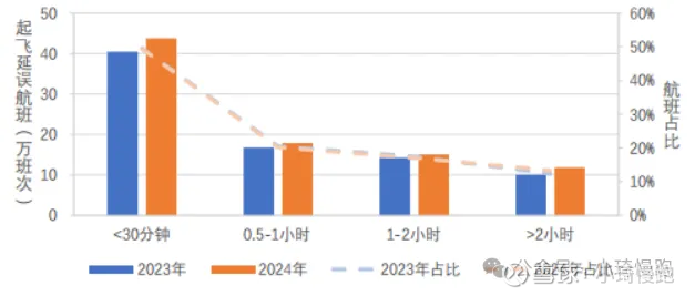 3)飞机半小时延误率较高铁高19个pct。根据国内民航局发布的2024年全国机场的离港正常率为81.05%,而根据国家统计局公布的2014年铁路出发正点率99.8%(2008-2014年数据),远远高于飞机正常起飞的概率。飞机若出现延误,有48.37%的概率会延误超过0.5小时,这也使得高铁对商务人士的吸引力更强,更大概率准时到目的地赴约。