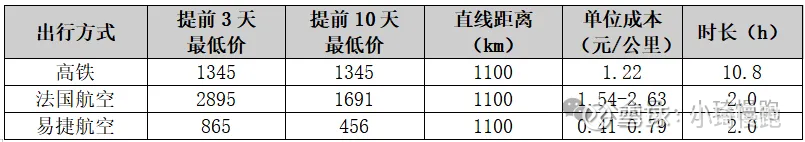 表3-1:欧洲巴黎-罗马高铁与飞机对比(元)