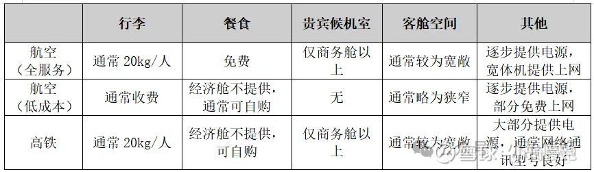 4)配套服务方面,高铁与民航不相上下,对经济舱来说餐食收费与低成本类似,但行李免费且上网通讯良好。对于服务政策,各类出行服务模式也因地制宜,利用不同运输方式的优劣势、以及客户定位提供相应服务,以此达到差异化竞争的目的。
