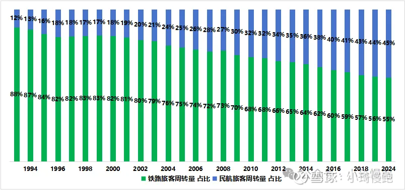 图4-4:中国远距离出行方式(民航与铁路)周转量(亿人公里)的占比趋势