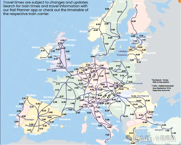 3)跨国普遍需要中转。由于没有统一协调,导致各个国家之间的铁路之间需要中转换乘,导致运行时间更长。巴黎到柏林需要8小时(直线距离880km),巴黎到罗马中途需要中转,时间更是达到11小时(直线距离1100km)。