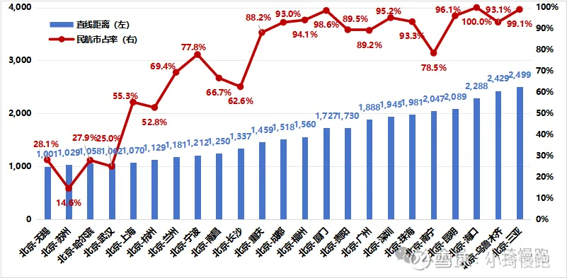 2)1500公里(或6-8小时以上)距离,民航仍有80%以上市场份额。从1500km开始,高铁出行时间往往达到6-8小时以上,相比民航2小时的出行时间,时效性明显减弱。并且由于高铁当前仅在白天运营,6-8小时以上意味着出行时间将会占用一个白天时间,且无法实现当天往返。