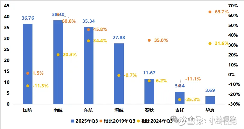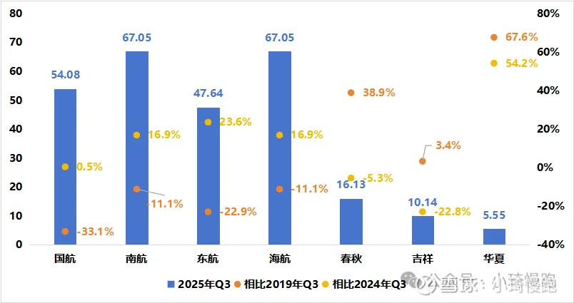 注:海航2019年Q3归母净利润仅1.08亿元,导致2025年Q3相比2019年增速奇高,剔除此数据。
