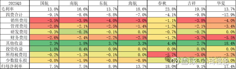 毛利率:2025年Q3春秋毛利率最高23.8%,国航、东航、华夏毛利率最低,分别为13.8%、13.7%、13.7%。