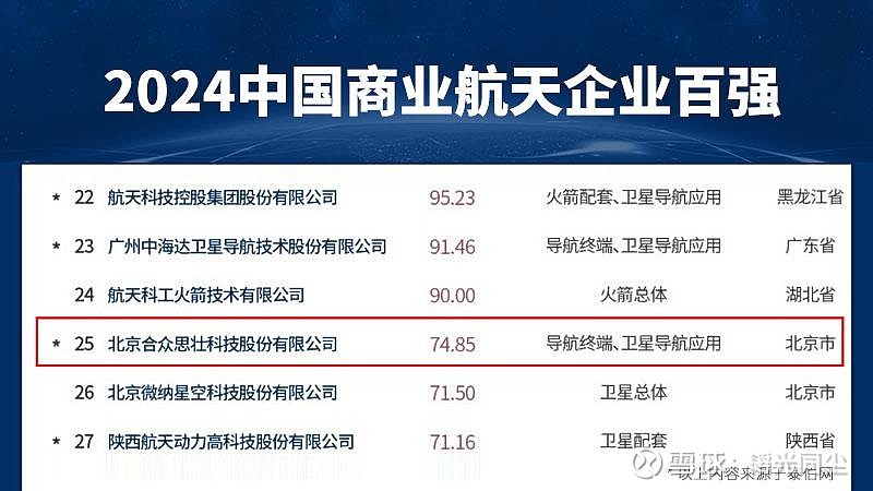 泰伯智库2024中国商业航天企业百强榜单中,合众思壮以74.85分位列第25位,是导航终端与卫星导航应用领域的核心企业。这一排名并非单纯的概念加持,而是对公司技术实力与市场能力的双重认可:
