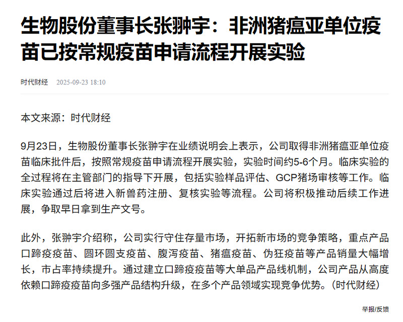 即将发布的非洲猪瘟疫苗:非洲猪瘟亚单位疫苗于2025年7月进入临床试验阶段,该项目潜在市场规模高达百亿人民币级别,是公司未来价值的核心驱动力。