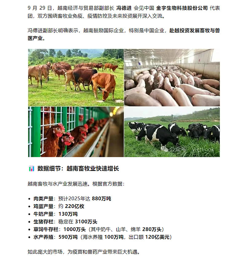 供需结构演变。供给层面,动物疫苗行业,研发能力是竞争输赢的胜负手。目前,疫苗正朝着新型的基因工程苗和多联多价苗这两大趋势演变,而这些都离不开卓越的研发能力和高级别安全实验室。需求层面,首先,国内宠物经济给疫苗的需求带来了增量,当前宠物疫苗年复合增速超过20%,已成为细分市场中增速最快的领域;其次在海外,国内的领先企业正在积极寻求海外市场,2025年 9 月 29 日,越南经济与贸易部副部长冯德进会见中国金宇生物科技股份公司代表团。会见中明确表示,越南鼓励国际企业,特别是中国企业,赴越投资发展畜牧与兽医产业。