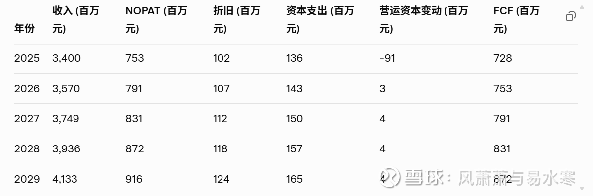 基于历史数据(2024年收入3,778百万元,FCF 823百万元),预测如下。FCF计算公式:NOPAT(税后经营利润) + 折旧 - 资本支出 - 营运资本变动。