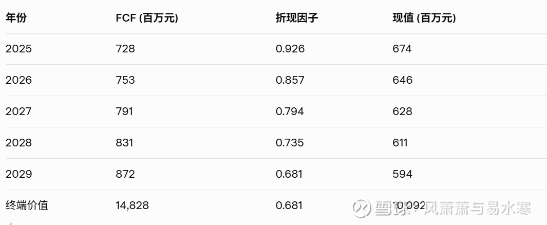 终端价值(2029年后):基于2029年FCF 872百万元,按永续增长2%计算,终端价值 = 872 × (1 + 0.02) / (0.08 - 0.02) = 14,828百万元。