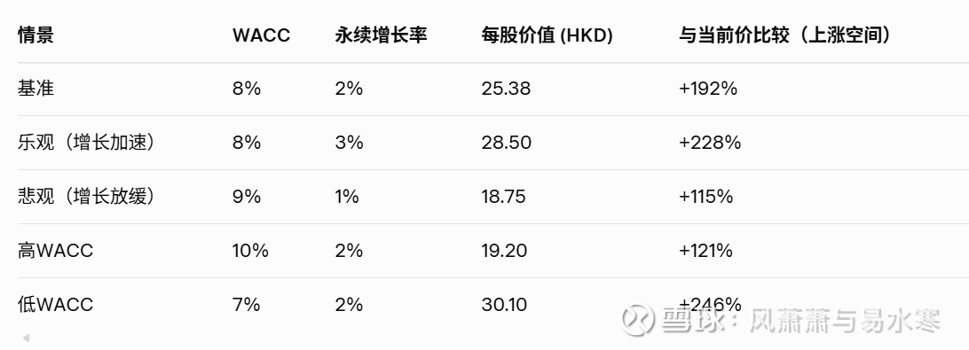 WACC:8%(基于无风险利率1.84%、权益成本约9.9%、债务比例低。公司Beta假设为1.0,权益风险溢价6%。该值与市场数据相符)。