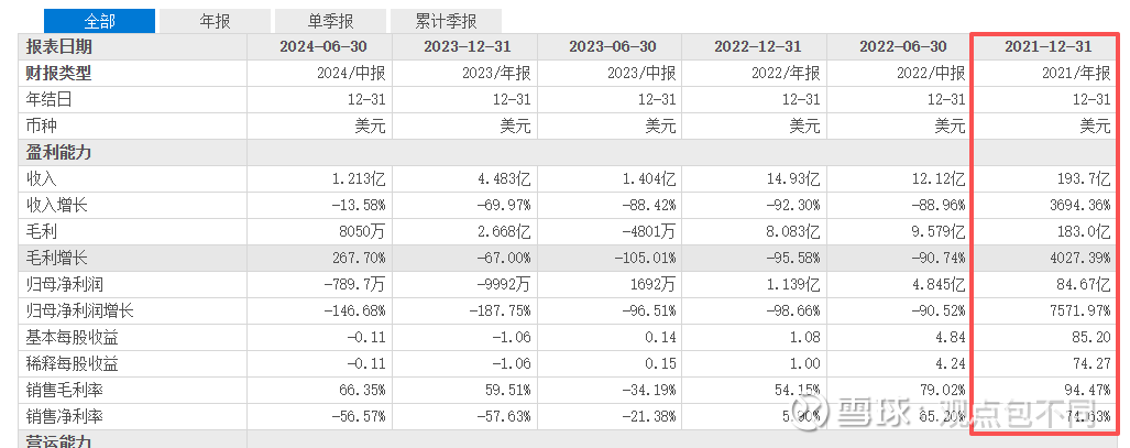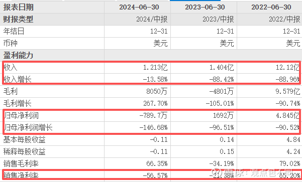 从2024年半年报看,公司营收1.213亿美元,同比下降13.58%;归母净利润为-789.7万美元,同比暴跌146.68%;销售净利率同比下降56.57%。