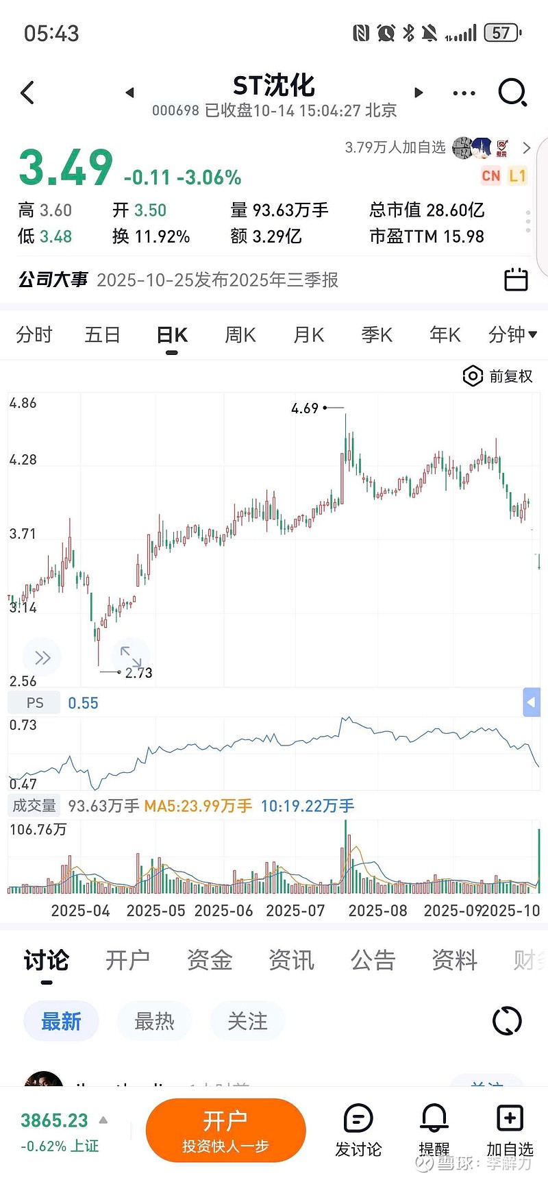$ST沈化(SZ000698)$ $ST板块(BK0400)$沈阳化工,成交3亿多,新华锦成交3亿多。。一年后才摘帽的股,这么着急去翘板。ST现在只需要跌两个多跌停了吗?为啥合力越来越差,因为有些兄弟走着走着就被套做股东去了,就剩我这种老实人,还在投机。。