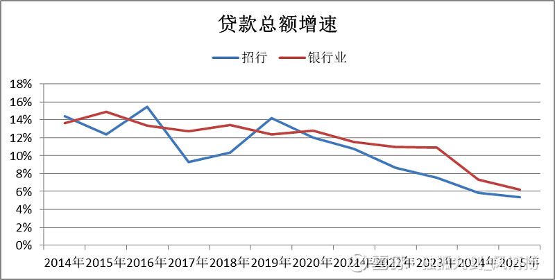 很有意思现象:如果看过去12年时间,很容易能够对比得到招行的信贷资产扩张速度在大多数年份都是跑输银行业整体大势的。(2014-25年的CAGR,招行是10%、国内银行业是12%)。