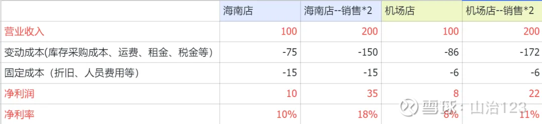 机场店 地盘是上机的、要交租金、租金和销售额直接挂钩 属于变动成本;海南店 地盘是自建的、比如土地使用权120亿、财务上一般按20年摊销、相当于每月有0.5亿固定的折旧费用、有没有销售都要发生