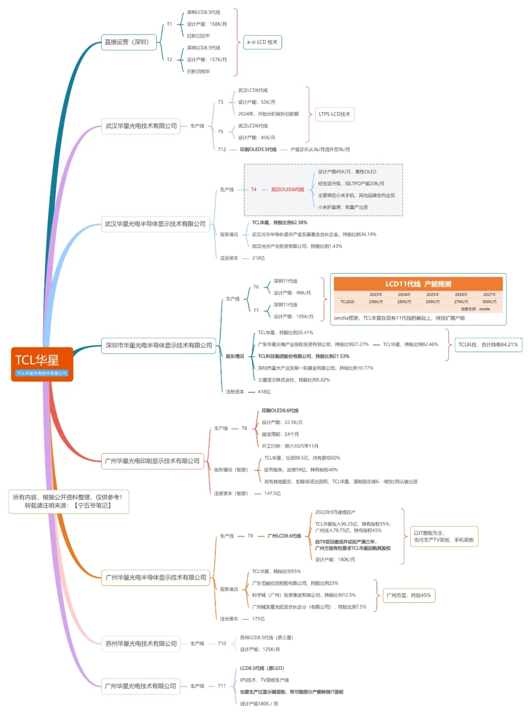 根据TCL科技的2025年半年报、相关公告,我更新了【TCL科技(TCL华星)面板生产线】的思维导图,本次主要是更新了T12、T8的情况,如下: