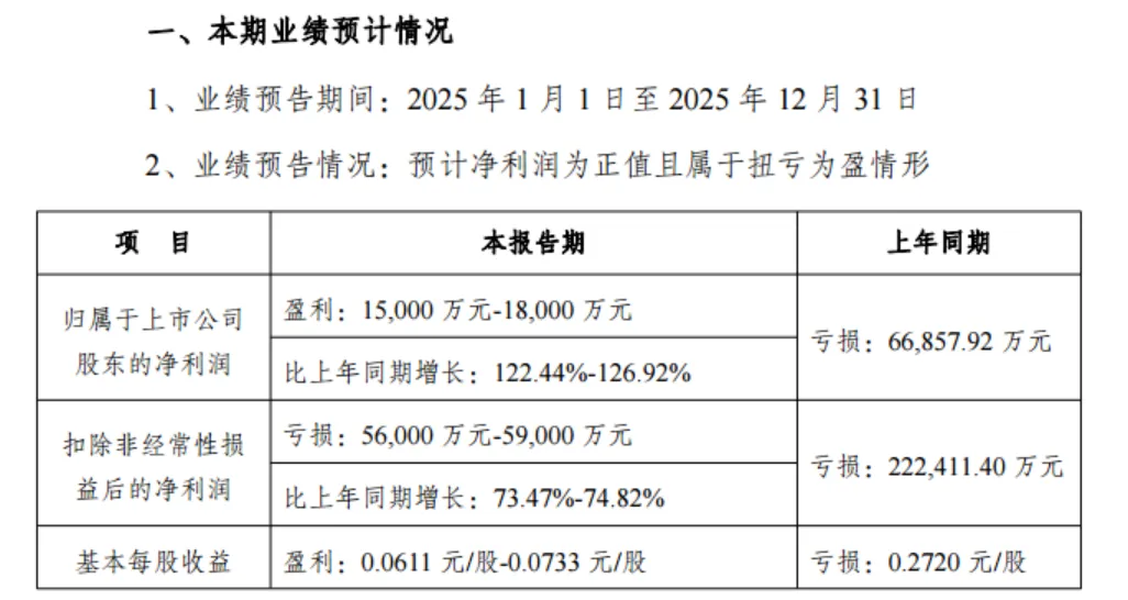 深天马A,发布2025年业绩预告,在连亏两年后,2025年实现扭亏为盈,如下图所示: