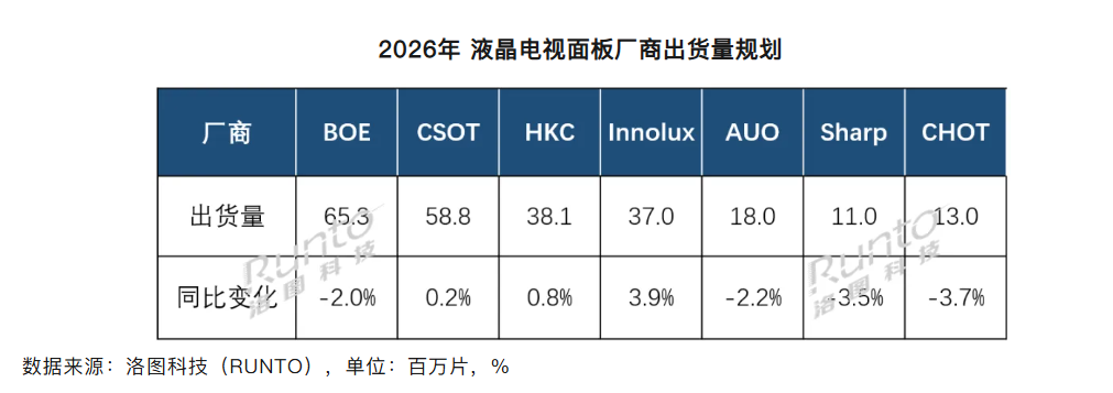 我们先来看洛图的一组数据,京东方A、TCL科技(TCL华星)、惠科、彩虹股份(彩虹光电)等厂商的2026年TV面板出货量规划,如下图所示: