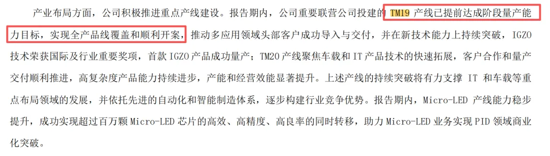 深天马A的相关表述,厦门TM19已经提前达成阶段量产能力目标,如下图所示: