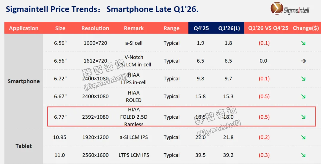 二,据群智的数据,入门级柔性OLED,2026年一季度的均价,依然在下降。