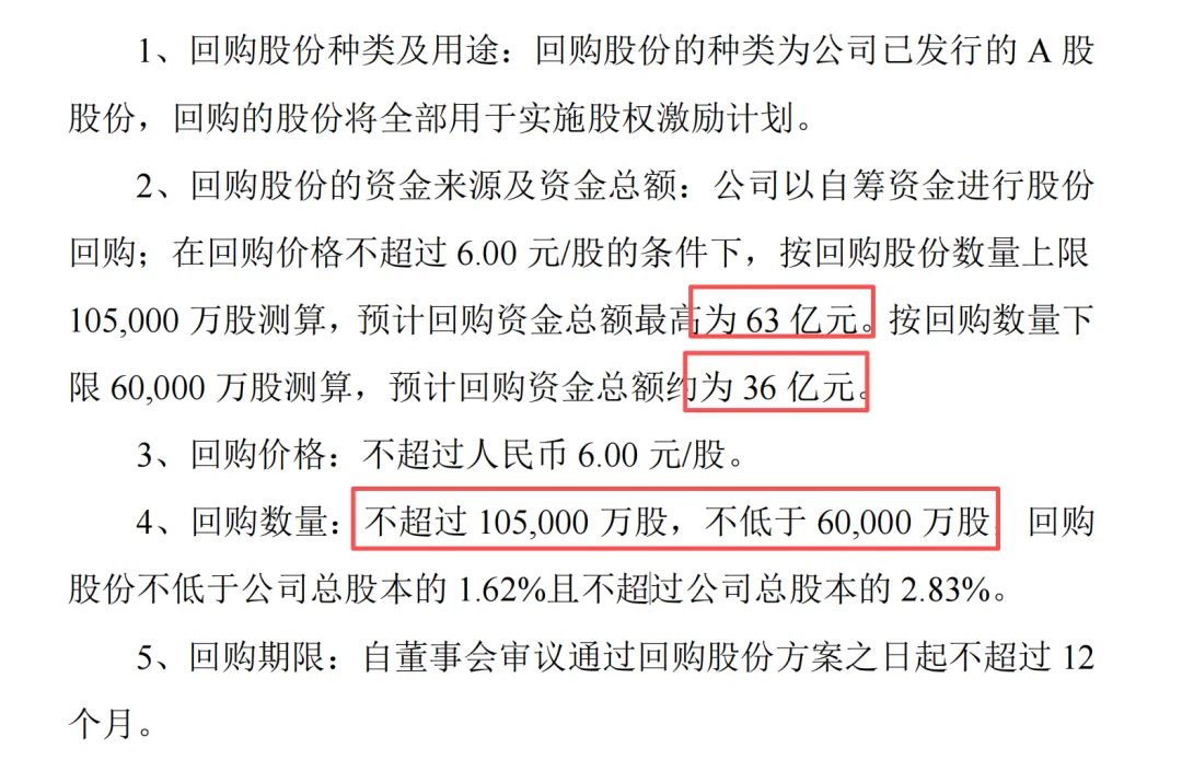 如果回购均价是4块,6亿股~10.5亿股,对应24亿~42亿;