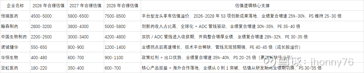 2026-2028 A股创新药部分上市公司核心梳理与估值展望: