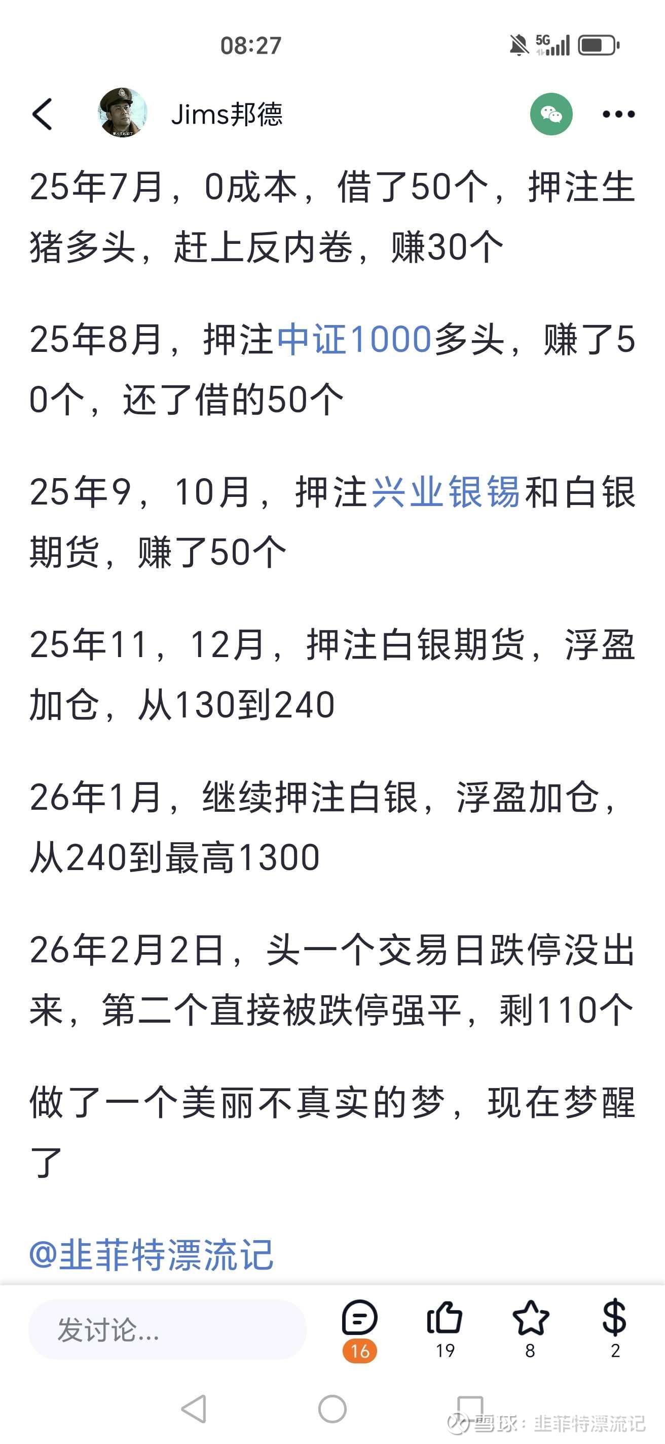 博主曾经发过一个截图,应该是60多手白银,暴赚的时候。我想过提醒他注意风险,但想了下,还是没提。万一白银真的涨到4万、5万、6万,那我变成罪魁祸首了。他人的因果,我不想干涉。