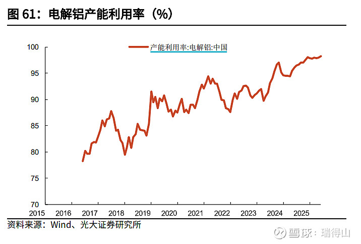 从2018年开始,国内电解铝需求持续稳步增长,即使在房地产整体下行的这几年,由于新能源和电力建设的带动,电解铝需求依然强劲,2025年5月份电解铝产能利用率达到自2012年有统计数据以来的最高点。