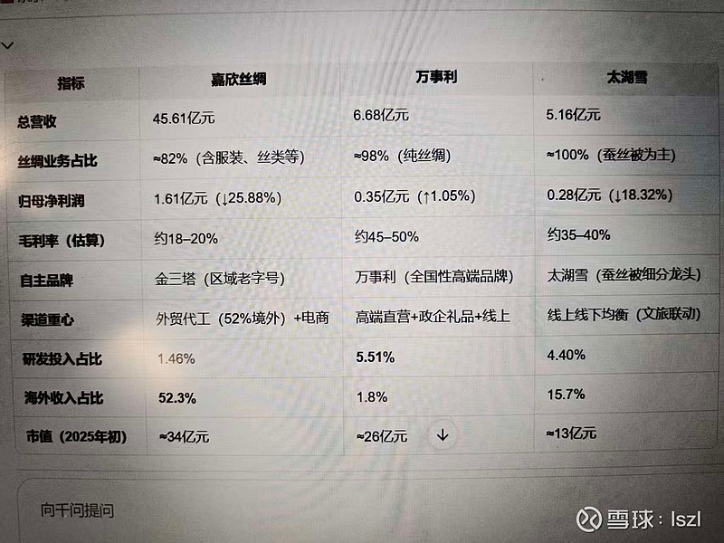 ✅ 优势:“蚕丝被=太湖雪”心智占位成功,在细分品类具统治力;深度绑定苏州文化IP(博物馆、古镇、非遗),打造“新国风”产品;线上渠道占比超50%,运营灵活;积极布局超级体验店,探索“丝绸+文旅”新模式。❌ 短板:产品单一,过度依赖蚕丝被(占营收55%);品牌全国认知度有限,主要集中在华东;规模最小,资本实力弱。$嘉欣丝绸(SZ002404)$ $万事利(SZ301066)$ $太湖雪(BJ920262)$