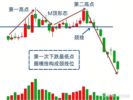 左顶:上涨后冲高回落,形成第一个顶,常伴随放量; 回落至颈线附近; 右顶:反弹至左顶相近价位但无力突破(多数略低),量能明显小于左顶; 跌破颈线(放量更可靠),颈线由支撑转为阻力。