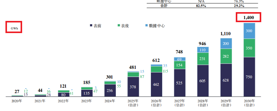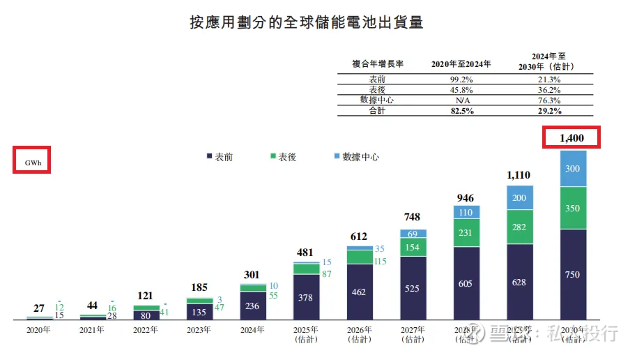双登股份今年8月份披露了港股招股说明书,里面通信与数据中心部分的预测较宁德时代要保守一些,同样剑指2030年出货量300GWh,宁德时代只包含锂电,而双登股份则是锂电230GWh+铅酸70GWh=300GWh。如下图: