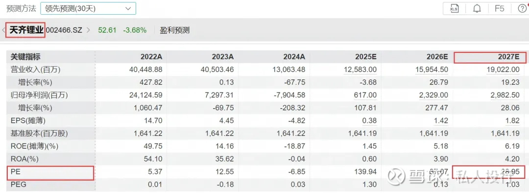 而天齐锂业2027年可是29倍: