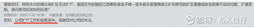3.安全距离:去年12月,天华新能斥资25亿元竞得“奉新县金子峰—宜丰县左家里矿区”陶瓷土(含锂)矿采矿权。这个矿区位于宜丰县的部分,正好跟化山瓷石矿同属花桥乡。网传两个矿区距离过近,不符合安全要求,这是化山瓷石矿安全生产许可证迟迟未能提升到900万吨的主要原因。目前天华新能没有表态,而永兴材料则表示: