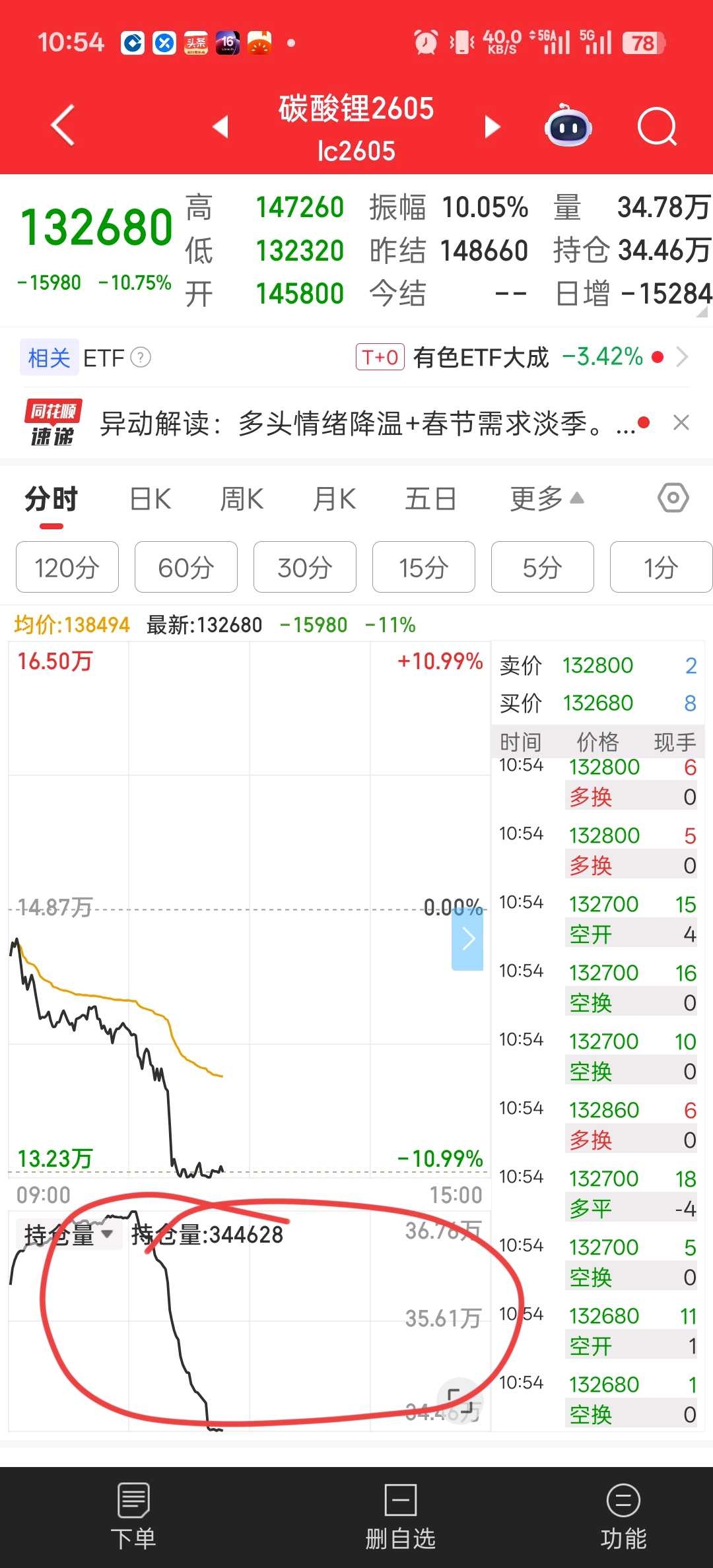目前仅仅半天,主力期货lc2605的持仓就从37.76万下降到了34.48万。