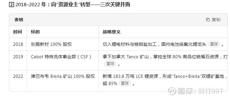 地勘技术服务 → 控制全球稀缺铯矿 → 锂盐自给龙头 → 铜矿第二曲线,