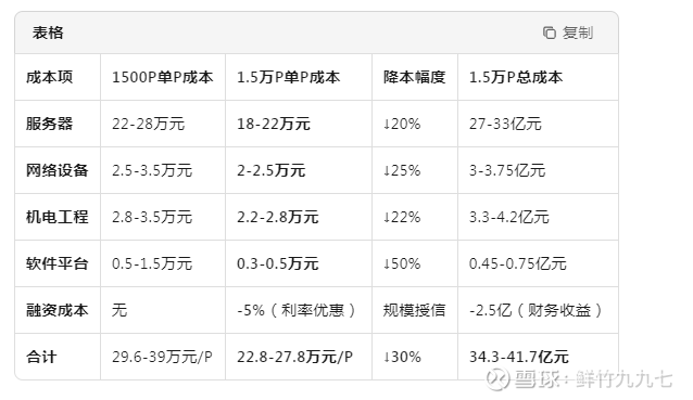 成本项1500P单P成本1.5万P单P成本降本幅度1.5万P总成本服务器22-28万元18-22万元↓20%27-33亿元网络设备2.5-3.5万元2-2.5万元↓25%3-3.75亿元机电工程2.8-3.5万元2.2-2.8万元↓22%3.3-4.2亿元软件平台0.5-1.5万元0.3-0.5万元↓50%0.45-0