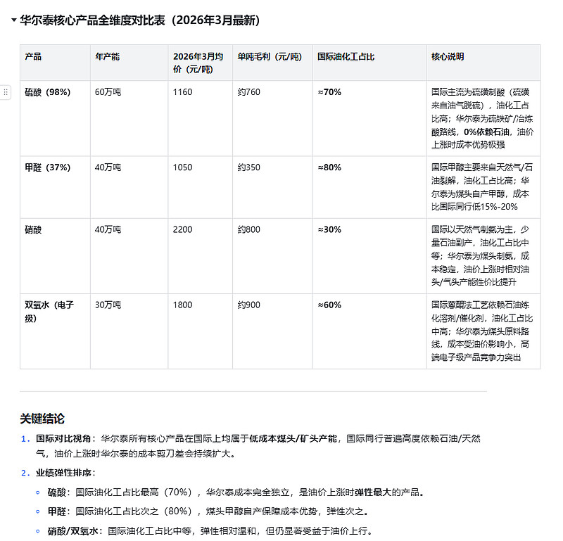 硫酸:国际油化工占比最高(70%),华尔泰成本完全独立,是油价上涨时弹性最大的产品。