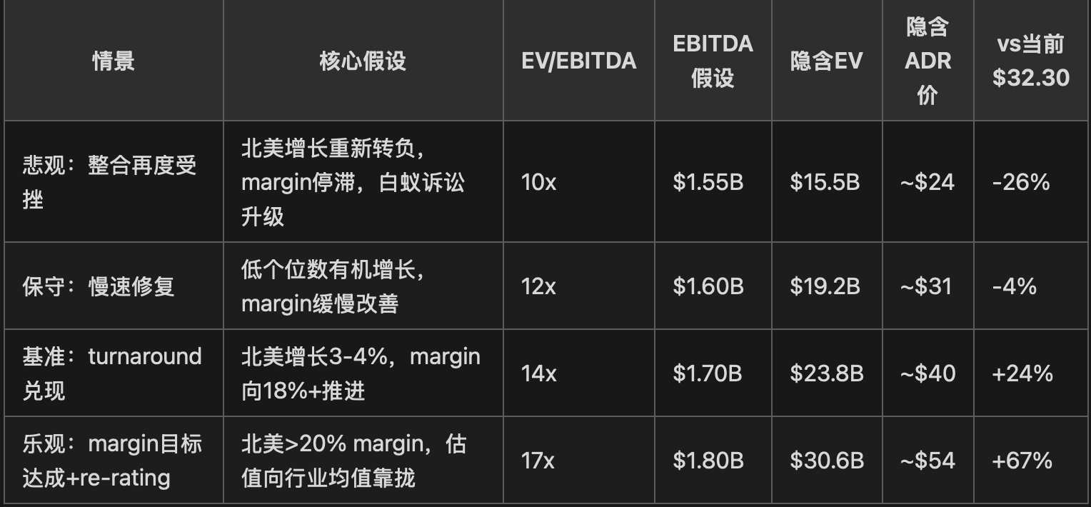 假设:净债务由 $3.65B 降至约 $3.3B(含 France Workwear 出售、白蚁赔付及正常 FCF),ADR 等效股数约 505M。