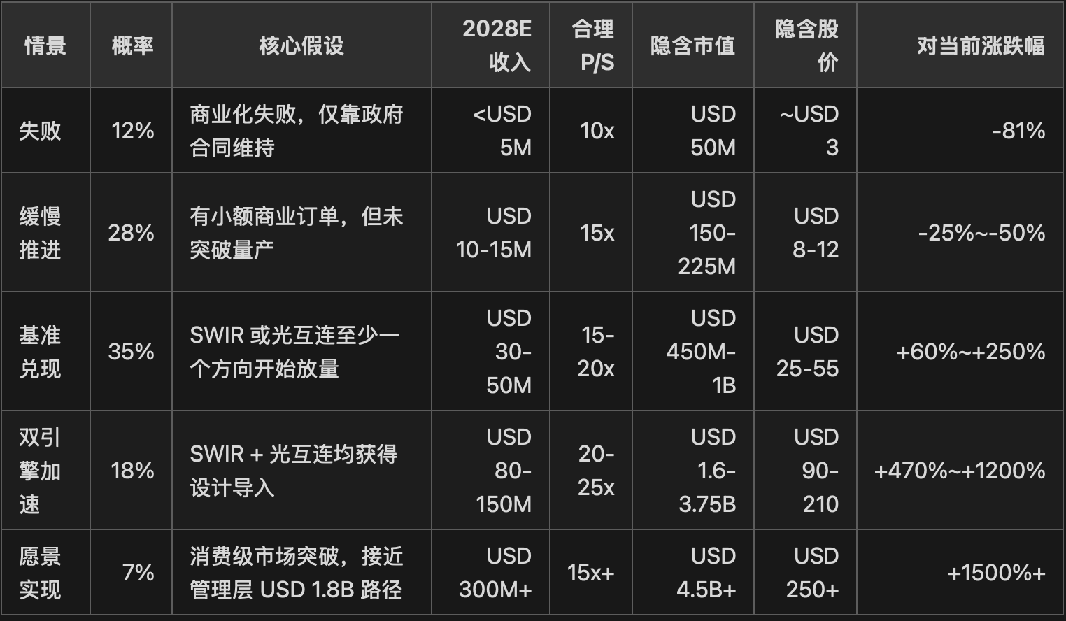 按这套框架,概率加权期望值约 USD 30-40/股;但分布高度右偏,最终结果几乎完全取决于 qualification 和 量产 两个节点是否穿越。