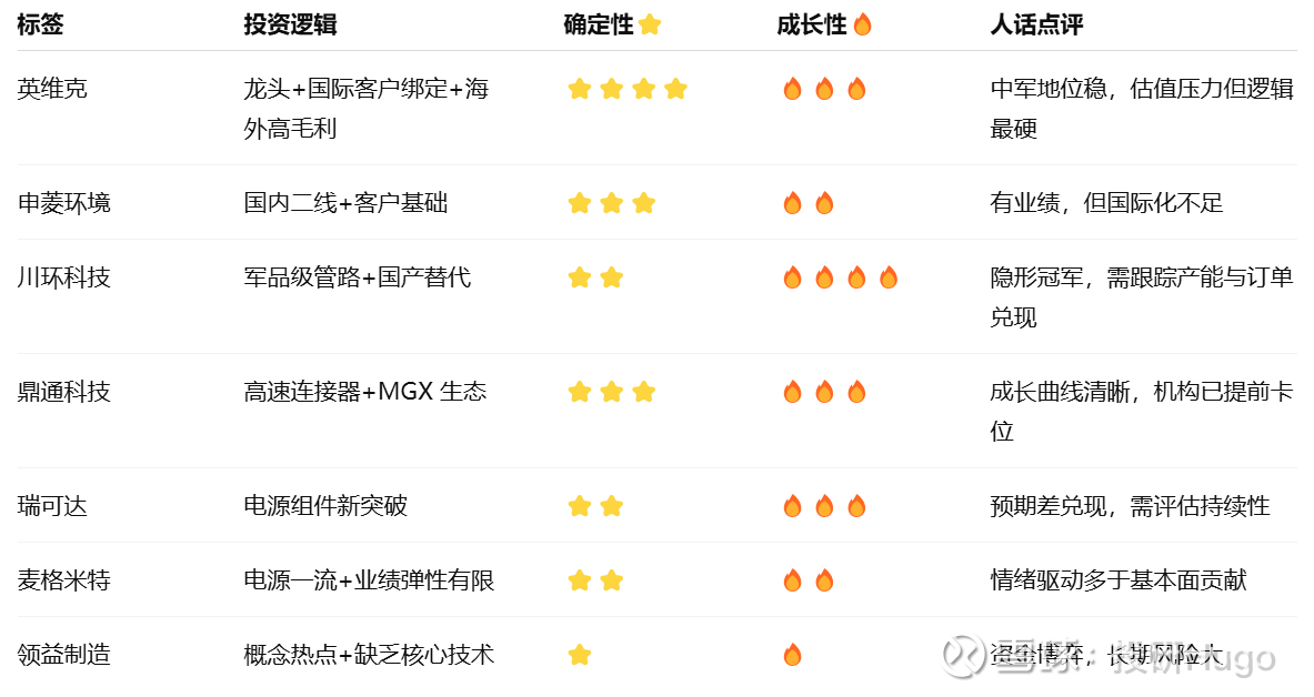 思泉新材拿到英伟达 GB200 小批量订单;奕东电子则已大批量供货 GB200/300 和 ASIC 客户。它们切入了全球最顶尖的算力芯片厂商供应链,具备爆发潜力,但业绩兑现高度依赖订单落地,波动风险较大。